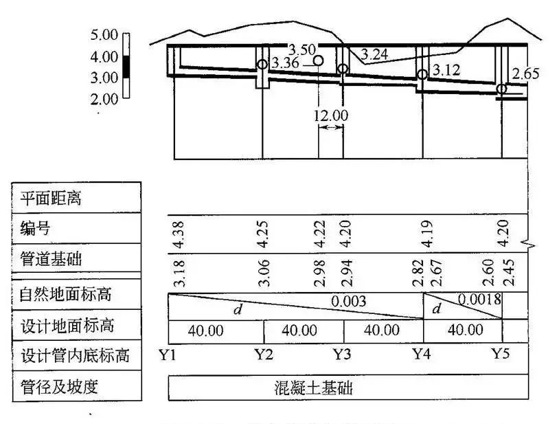 表示地面起伏情况、管道敷设深度、管道直径及坡度、与其他管道交接情况。