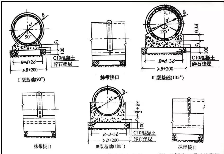 按管座的形式,分为90度、135度、180度、360度四种管座基础,根据管道埋置深度选择。