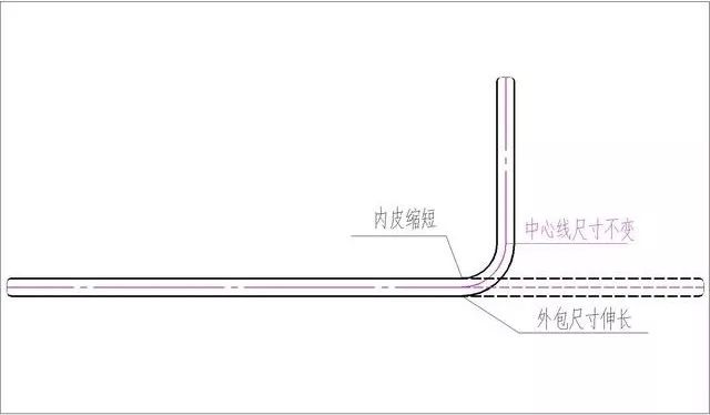 作为一种具有良好变形性能的建筑材料,钢筋弯曲的特点是在弯曲处内皮缩短,外包尺寸伸长,而中心线尺寸不变(如下图所示),所以我们只要把握住中心线尺寸,就可以得到钢筋的下料长度。