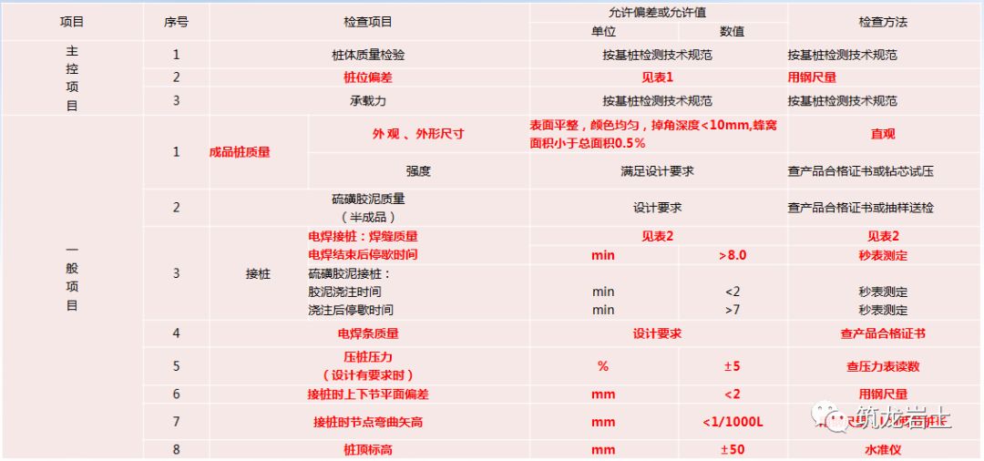 注:①表1、2、3、4选自GB50202-2002《建筑地基基础工程施工质量验收规范》其中个别数据依据JGJ94-2008《建筑桩基技术规程》做了相应调整;②表中“基桩检测技术规范”参见JGJ106-2014《建筑基桩检测技术规范》。