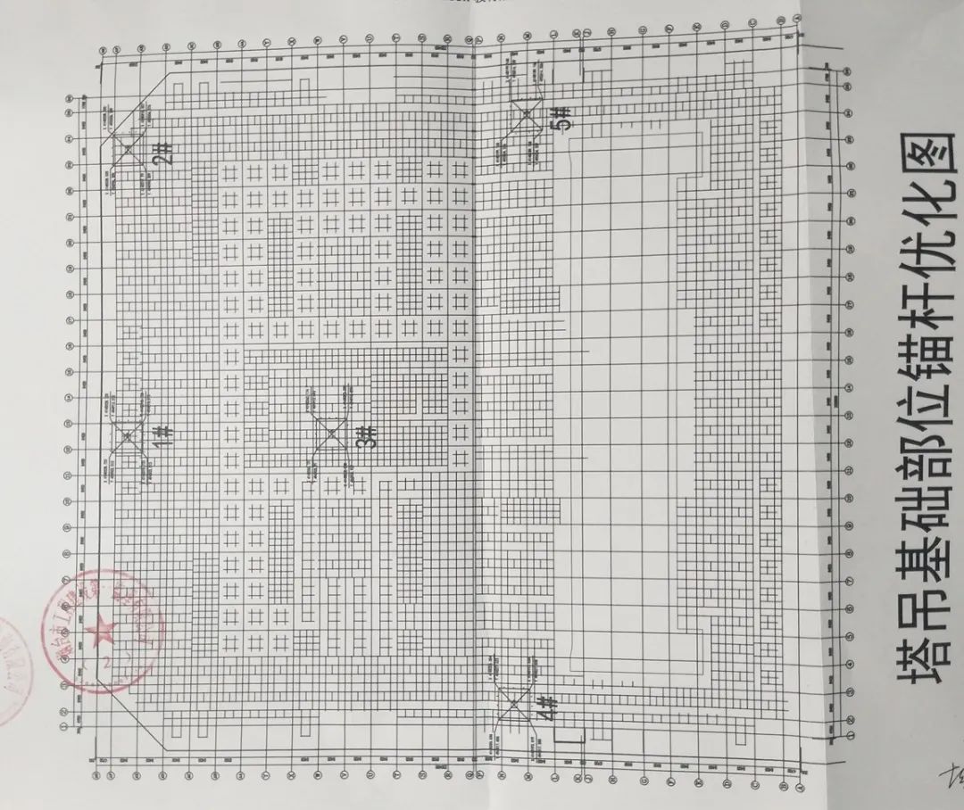 本工程共设塔吊11部,所有塔吊基础均落于基础筏板内,筏板厚度分为1.6m跟0.6m两种情况,1.6m厚筏板区域筏板配筋与塔吊基础相同,均为HRB400 25@200双层双向,现场将筏板钢筋与塔吊基础钢筋共用,减少塔吊基础钢筋的浪费,0.6m厚筏板区域,考虑到塔吊基础增加配重的情况,经项目部与设计院沟通,设计院根据塔吊基础配重进行计算,每个塔吊基础可减少锚杆5根,即减少了现场的工期,又省去了塔吊基础的钢筋浪费,为项目部创造效益。