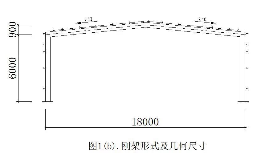 河南省某加工厂一厂房,该厂房为单层,采用单跨双坡门式刚架,刚架跨度18m,柱高6m;共有12榀刚架,柱距6m,屋面坡度1:10;地震设防列度为6度,设计地震分组为第一组,设计基本地震加速度值0.05g。刚架平面布置见图1(a),刚架形式及几何尺寸见图1(b)。屋面及墙面板均为聚氨酯复合保温板;考虑经济、制造和安装方便,檩条和墙梁均采用冷弯薄壁卷边C型钢,间距为1.5m,钢材采用Q235钢,焊条采用E43型。