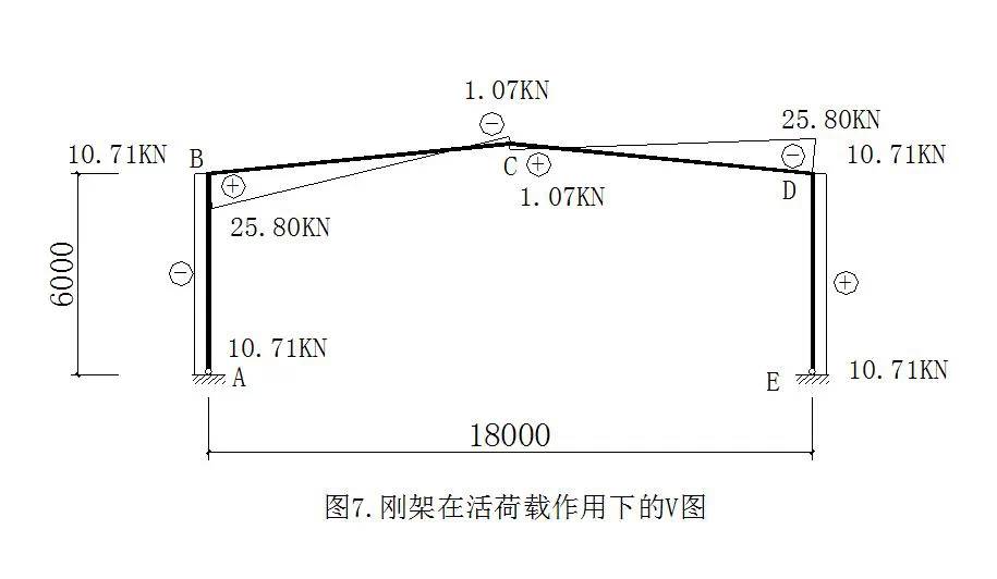 考虑本工程刚架跨度较小、厂房高度较低、荷载情况及刚架加工制造方便,刚架采用等截面,梁柱选用相同截面。柱脚按铰接支承设计。采用弹性分析方法确定刚架内力。引用《钢结构设计与计算》(包头钢铁设计研究院编著,机械工业出版社)中表2-29(铰接柱脚门式刚架计算公式)计算刚架内力。